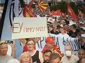 The protests, which started on 2 July, are organized by some nationalist and leftist parties, primarily VMRO-DPMNE, its coalition Renewal, Levica, Democratic Party of Serbs in Macedonia and others.[25] They rejected the EU's proposal to approve the country's negotiating framework, also known as the French proposal. The protesters rallied under the slogan "Ultimatum, No Thanks!"[26] They also carried posters with inscriptions: "Fuck the EU" and "Bulgarian fascism - European value".[27] On July 4, protesters symbolically burned the 2017 Treaty of Friendship, Good Neighborliness and Cooperation with Bulgaria, the 2018 Prespa agreement with Greece and the so-called French proposal for the start of North Macedonia's negotiation process with the EU, calling these documents fascist.[28][29] Macedonian singer Lambe Alabakovski, who burned the documents, was arrested a month earlier by the police in Bitola in connection with the burning of a Bulgarian cultural center in the city.[30] On 5 July, 47 policemen were injured. Protesters threw various items at the parliament building, government building and the building of the Ministry of Internal Affairs in Skopje. Offensive and even vulgar chants against the European Union and Bulgaria were heard during the protests. Slogans were raised that Bulgaria is a “fascist state” and the EU is a “fascist union”.[31] Protesters in Skopje carried mostly the former national flag, abandoned under Greek pressure, because of its relation to the controversial antiquization nation building policy,[32][33][34] as well as red flags with communist symbols, while the European flag was set on fire in one instance.[35] The protesters demanded the resignation of the government and chanted also for the restoration of the former name of the country, disputed by Greece, because of its origin. Violence escalated further when groups of ethnic Macedonians and Albanians, clashed in the centre of Skopje, at the Skanderbeg Square. During the clash demonstrators threw stones at a group of people and three armed people were present, shots were fired into the air. The armed people were later apprehended by the police. As a result of the protests, the "Albanian Alliance" ended any partnership with the opposition, which practically left it isolated, because the other Albanian formations support the government. On 14 July, thousands of protesters protested in front of the parliament, while the French proposal was being discussed. President of the European Commission Ursula von der Leyen came to address the parliament, where she was met with whistles and jeers from the opposition MPs. The opposition MPs wore t-shirts with the word “no’ written on them in red and held up banners against the French proposal. At one point, MP Apasiev served von der Leyen a pamphlet with a large "NO" written on it. Prime Minister Dimitar Kovačevski also addressed the parliament and asked the MPs to accept the deal, while the opposition MPs protested.[36][37] During the same day, a demonstration march was led by Kumanovo Municipality Mayor Maksim Dimitrievski in Kumanovo.[38] On the next day an opposition lawmaker compared von der Leyen's visit to the Nazis' activity related to the Law for the Prevention of Hereditarily Diseased Offspring. VMRO-DPMNE also threatened that Prime Minister Kovačevski will be in prison for what he is doing to (North) Macedonia and its people.[39] On July 16, the former Foreign Minister from VMRO-DPMNE Antonio Milošoski accused the ruling Social Democrats of treason. A deputy of the SDSM, asked him "who are you to call us traitors, you who has several passports in your pocket", alluding to the claims that he has Bulgarian citizenship,[40] as many other Macedonians.[41] At the end of the same session, with 68 "yes" votes, the parliament approved draft conclusions, giving the government a mandate to negotiate within the so-called "French proposal".[42]