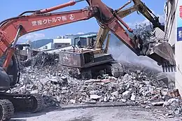 Along Zhongshan Road in Yuli, Hualien, a three-storey building housing a 7-Eleven store collapsed, injuring four people, who were all rescued.[37][38] Part of the Dongli railway station was damaged and a train was derailed, and all 20 passengers were evacuated.[39] In Yuli, Hualien County, part of a highway collapsed, injuring three people.[40] Several other bridges were also damaged.[41] In Taoyuan, a sports center collapsed, injuring two people.[42] In Yuli, a cement factory collapsed, killing a 69-year old worker and injuring several others.[43][44] In total, there were 171 reported injuries, most of them in Hualien and Taitung Counties.[45][46]