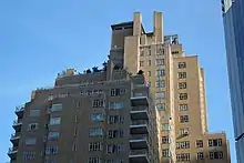 240 Central Park South occupies about half of its land lot.[13][23][24] The building is largely "C"-shaped in form and contains two primary sections, a 28-story section on Central Park South and a 15-story section on 58th Street, connected by the lobby running along Broadway.[13][23] Atop the main roofs of each apartment block are placed chimneys and water towers.[25][26][27] 240 Central Park South is variously quoted as having either 325,[23] 326,[26][27] or 327 apartments across its two apartment blocks.[28][lower-alpha 2]