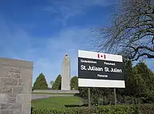 The village of St. Julien (now Sint-Juliaan; 50.890°N 2.937°E) was in the rear of the 1st Canadian Division until the poison-gas attack of 22 April, when it became the front line. Some of the first fighting in the village involved the stand of lance corporal Frederick Fisher of the 13th Battalion CEF's machine-gun detachment; Fisher went out twice with a handful of men and a Colt machine gun, preventing advancing German troops from passing through St. Julien into the rear of the Canadian front line. He was killed the following day.[14]