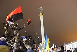 After the rally, a large group of Ukrainian protesters toppled the statue to Lenin in Kyiv.[99] Unlike the previous week, police officers on the scene withdrew without attempting to defend the monument.[100] After the statue was taken down, the group shouted "Yanukovych, you'll be next!", and proceeded to smash the statue with a sledgehammer, decapitate it, and dismantle it for souvenirs;[101][102] in place of the statue was planted a Ukrainian and red-and-black insurgency flag.[100] The Svoboda party took credit for the statue's destruction, with several party MPs, including Ihor Miroshnichenko, joining the crowd and taking part in the act.[102][103]