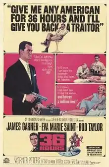 36 Hours is a 1964 American war thriller film written for the screen and directed by George Seaton from a story by Carl K. Hittleman and Luis Vance, based on the 1944 short story "Beware of the Dog" by Roald Dahl.[3] The film stars James Garner, Eva Marie Saint, Rod Taylor, and Werner Peters. In the plot, a Nazi German army doctor tries to obtain vital information from an American military intelligence officer by convincing him that it is 1950 and World War II is long over.