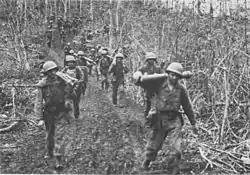 The division's next assignment was Bougainville as part of the I Marine Amphibious Corps. Landing between 8 and 19 November 1943, the 37th Division expanded the western beachhead sector, constructed roads and bridges, and engaged in extensive patrol activity. On 15 December 1943, IMAC was relieved by the XIV Corps, to which the 37th Division was then assigned. In March 1944, two Japanese divisions made eight major attacks, but division lines held. In April patrols cleared the Laruma Valley area of major enemy units. The division remained on Bougainville and trained for the Luzon campaign. Landing with the Sixth Army on the beaches of Lingayen Gulf, 9 January 1945, the 37th raced inland against slight resistance to Clark Field and Fort Stotsenburg where fierce resistance delayed capture of those objectives until 31 January. The division continued to drive to Manila against small delaying forces, and entered the city's outskirts, 4 February. Upon crossing the Pasig River, it ran into bitter Japanese opposition.[1] By heavy street fighting, American and Filipino troops cleared the city by 3 March 1945.