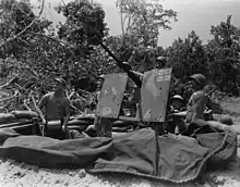 The division's next assignment was Bougainville as part of the I Marine Amphibious Corps. Landing between 8 and 19 November 1943, the 37th Division expanded the western beachhead sector, constructed roads and bridges, and engaged in extensive patrol activity. On 15 December 1943, IMAC was relieved by the XIV Corps, to which the 37th Division was then assigned. In March 1944, two Japanese divisions made eight major attacks, but division lines held. In April patrols cleared the Laruma Valley area of major enemy units. The division remained on Bougainville and trained for the Luzon campaign. Landing with the Sixth Army on the beaches of Lingayen Gulf, 9 January 1945, the 37th raced inland against slight resistance to Clark Field and Fort Stotsenburg where fierce resistance delayed capture of those objectives until 31 January. The division continued to drive to Manila against small delaying forces, and entered the city's outskirts, 4 February. Upon crossing the Pasig River, it ran into bitter Japanese opposition.[1] By heavy street fighting, American and Filipino troops cleared the city by 3 March 1945.