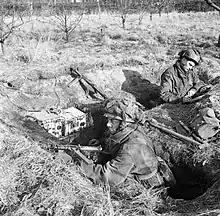 In the British sector the 3rd Parachute Brigade would be the first unit to arrive in Germany.[68] Their initial objective was to secure the western edge of the Schneppenberg woods.[69] Brigade headquarters was fully aware of the expected opposition to the landings, and the commander of the 224th (Parachute) Field Ambulance was warned to prepare for around 600 casualties; almost a third of the brigade's manpower.[70] On 24 March 1945 at 07:00 the 122 C-47 Dakotas transporting the brigade took off from England in three waves.[71][72] The first wave carried brigade headquarters and the 8th Parachute Battalion, the second carried the 1st Canadian Parachute Battalion, and the 9th Parachute Battalion came last.[72] The gliders carrying the brigade's heavy equipment were scheduled to arrive 40 minutes after the third wave.[73] Nine minutes ahead of schedule, the brigade started landing at their DZs. Their premature arrival stopped the Allied artillery and fighter bombers which were engaging targets in the area, especially anti-aircraft gun emplacements. The descending parachutists were met with heavy fire from the German defenders, causing several casualties. One of the dead was the commanding officer of the 1st Canadian Parachute Battalion.[68] It was during the landing that one of the Canadian medics, Corporal Frederick Topham, won a Victoria Cross, becoming the division's only recipient of the award during the war.[68] By 11:00 the 8th Parachute Battalion had secured the DZ, and the other two battalions headed for the Schneppenberg woods, which were secured by 14:00. The 9th Parachute Battalion dug in within the woods, and the 1st Canadian Parachute Battalion on the outskirts.[74] At 15:00 the first troops of the Royal Scots arrived after completing their assault crossing of the Rhine. The day's fighting had cost the brigade 80 dead and 190 wounded, however they had taken around 700 prisoners.[74]