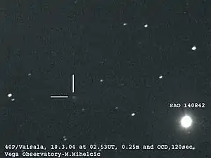 40P/Väisälä is a periodic comet that was discovered on February 8, 1939. Its orbit was determined on April 26, 1939.[3] In 1994, the diameter of its nucleus was found to be 4.2 km, similar in size to that of Comet Encke.[2]