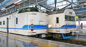 ![]() 419 series trains at Fukui station, showing the differing cab end designs, April 2008 | |