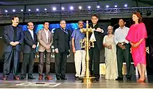 The Minister of State (Independent Charge) for Information & Broadcasting, Shri Manish Tewari lighting the lamp to inaugurate the 44th International Film Festival of India (IFFI-2013), in Panaji, Goa on November 20, 2013. The Chief Minister of Goa, Shri Manohar Parrikar, the Secretary, Ministry of Information and Broadcasting, Shri Bimal Julka, Actor Kamal Haasan, Actress Waheeda Rehman and American actress Mrs. Susan Sarandon are also seen.