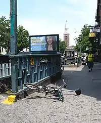 The southbound platform formerly had an exit-only at the center that led to 46th Street. Evidence of this includes a gated door on the platform wall and adjacent "EXIT" signs.[39][40] The northwest corner exit was closed after it was accidentally destroyed by nearby construction workers. On May 16, 1979, Community Board 7 held a meeting to determine whether residents wanted the entrance closed.[41] The board's chairman cited crime as a reason to close the entrance. The New York City Transit Authority promised to comply with the wish of the board, and the entrance was closed.[42]