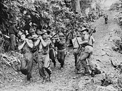 In September 1939, the brigade consisted of three infantry battalions—the 22nd, 29th and 46th Battalions[32]—and it was initially assigned to the 3rd Division.[33] Following Japan's entry into the war in December 1941, however, the 4th Brigade was mobilised for war service and raised to a higher state of training at Bonegilla, Victoria.[34] At this time the brigade was assigned a reserve response force role, and in March 1942, the brigade moved to Warwick, Queensland, and from there to Chermside to take up defensive positions around the north of Brisbane. Later in the year, the brigade was reorientated to defend the southern approaches to Brisbane. Later in the year, the brigade moved to Forest Glen, Queensland on the Sunshine Coast.[35] In March 1943, the brigade was transferred to the 5th Division and it was deployed to New Guinea, being dispatched to Milne Bay to relieve the 7th Brigade.[36] Later, the brigade took part in the Huon Peninsula campaign, and it was amongst the first of the Militia brigades to see action against the Japanese at Guiska. At that time, the brigade consisted of the 22nd, 29th/46th and 37th/52nd Infantry Battalions.[37] Throughout 1943 and 1944 the brigade was transferred between the 5th and 9th Division a number of times, taking part in the New Guinea campaign.[33]