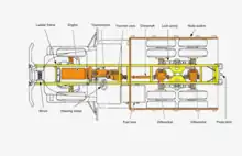 A ladder frame with three live beam axles, the front on leaf springs, the rear tandem on leaf springs with locating arms. Brakes on the M39 and M809 were air over hydraulic with drum brakes on all wheels, M939s were full air. Many trucks were available with a front-mounted 20,000 lb (9,100 kg) capacity winch.[25][26][27]