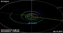 The orbit of 50 Virginia places it in an 11:4 mean motion resonance with the planet Jupiter. The computed Lyapunov time for this asteroid is only 10,000 years, indicating that it occupies a chaotic orbit that will change randomly over time because of gravitational perturbations of the planets.[8]