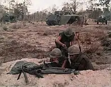 Members of Company A, 1st Battalion, 50th Infantry setting up a M60 machine gun position during a search and clear mission in the Vietnam War, 1970. M113 armored personnel carriers are visible in the background.