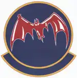 2. Approved 11 September 1944. Description: Over and through a yellow lemon disc, border triparted red, white, and blue, a prehistoric bat, in flight, red and white, with wings black, trimmed yellow, snorting steam from the nostrils, and grasping a small black aerial bomb in each foot.