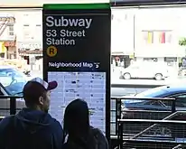 - Cox, Jeremiah (June 9, 2009). "A 53 Street platform sign, text and a arrow for 52 St is painted beneath this one". subwaynut.com. Archived from the original on March 8, 2016. Retrieved March 26, 2017.