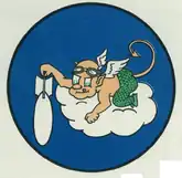 - Approved 3 July 1943. Description: On a medium blue disc, border black, a devilish cherub, face arms, body, and barbed tail flesh colored, wings white, tongue and finger nails red, eyes and horns green, wearing leaf trousers yellow-green and aviator's goggles brown, leaning over edge of white cloud formation and dropping a gray aerial bomb, point to base with right hand.