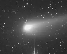 Churyumov–Gerasimenko was discovered in 1969 by Klim Ivanovich Churyumov of the Kyiv University's Astronomical Observatory,[26] who examined a photograph that had been exposed for comet Comas Solà by Svetlana Ivanovna Gerasimenko on 11 September 1969 at the Alma-Ata Astrophysical Institute, near Alma-Ata (now Almaty), the then-capital city of Kazakh Soviet Socialist Republic, Soviet Union. Churyumov found a cometary object near the edge of the plate, but assumed that this was comet Comas Solà.[27]