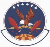 - Approved 18 February 1952. Description: On a shield sky blue, between a cross red, edged white, in the two upper quarters, six bombs, points downward, three on either side of the cross, white, shaded blue, in the two lower quarters eight stars, four on each side of the cross, white, markings blue, in base over the cross a sphere white, markings blue, over the center of the cross a star white. thereover an eagle flying blue, markings white.