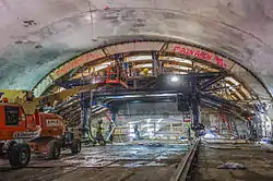 Cavern drilling was finished in August 2012;[52] however, blasting for the station entrances was not completed until February 28, 2013.[53][54] Demolition of a muck house, erected in August 2011[55] to remove mud from the tunnels, started in April 2013[56] and was finished by October 2013.[57] By January 2013, almost 96.3% of excavation was completed, with 177,873 cubic yards (135,994 m3) of dirt excavated from the station; waterproofing was also being done in the station and the tunnels south of it.[58][59] The contract for the station's finishing touches, including the electrical, plumbing, track, and signal systems, as well as entrances and exits, was awarded to Judlau Contracting at a price of $258 million in February 2013.[60] As of May 12, 2014, the mezzanine level of the station was completed and being used to store equipment.[61] In September, the station's size was gauged by Gothamist to be so large that "55,000 elephants could fit" within the enormous cavern.[62]