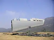 Hertz convinced the client to purchase the 747 airplane, originally worth about $25 million when Boeing completed it in 1970, for US$35,000. Mark Thompson of Thompson Aviation sold the airplane and his team detoxified, cut apart, and transported the plane for airlift. Using a laser and the cut-off saws at the Victorville Airport, home of the second largest airplane graveyard in the nation, the cockpit and tail were removed and the fuselage cut longitudinally. Next, transverse sectioning reduced large segments of fuselage and the wings to a manageable size for transport. A truck carried the parts, measuring 47 by 125 feet (14 by 38 m), successfully without damage. Seven California Highway Patrol vehicles escorted the truck during the night and closed multiple lanes of three major freeways, State Routes 2 and 15, and US Route 101, to accommodate the vehicle. The wings traveled from the Southern California Logistics Airport aircraft boneyard to Camarillo Airport in Oxnard, California, located 10 miles from the site. At that point, because each wing weighed approximately 20,000 lb (9,100 kg) and the only way to transport such heavy, unwieldy sections to a remote destination was from above (navigation by truck was deemed impossible), the wings needed to be cut in two for proper positioning for transport by helicopter, which was completed by a Columbia Model 234 operated by Columbia Helicopters Inc. of Portland, Oregon and took over two hours to complete. The helicopter positioned the wings on a large pile of tires at the site. The wings were then spliced back together and lifted onto columnar supports, attaching the custom fabricated steel brackets on the columns to the engine mounts on the wings. The wings touched the ground at few points creating minimal foundation requirements.