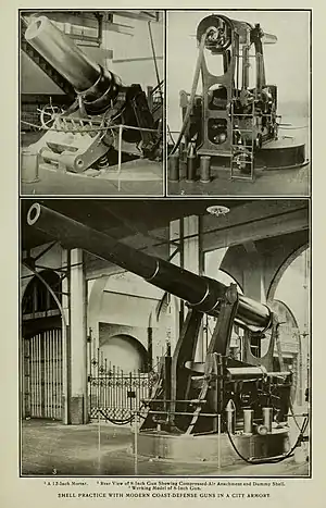 The M1888 8 in (203 mm) gun was a coastal artillery gun initially deployed as part of the Endicott system of fortifications. The first nine were deployed on the M1892 barbette carriage in 1898, but the improved M1894 and M1896 disappearing carriages soon became available, and approximately 64 additional weapons were deployed on these carriages by 1908. An "emergency" converted Rodman carriage was also used during the Spanish–American War in 1898 to quickly arm 21 emplacements with the modern 8-inch M1888 gun.[4][5] These weapons were redeployed soon after the war ended. The disappearing carriage allowed the gun to remain behind a parapet resembling a hillside most of the time, thus largely invulnerable to low-angle enemy fire, which was the only type of enemy attack anticipated 1898–1910. Air and high-angle artillery attack would eventually severely impact US fortifications in the Philippines in World War II. Numerous additional weapons of other calibers including the 10-inch gun M1895, 12-inch gun M1895, and 12-inch coast defense mortars were also deployed in US coastal fortifications alongside the 8-inch guns. The 8-inch guns were deployed in the harbor defenses of Portland, Maine, Portsmouth, New Hampshire, New Bedford, Massachusetts, Long Island Sound, New York, Eastern New York, Southern New York, Delaware River, Baltimore, Maryland, Potomac River, Chesapeake Bay, Cape Fear River, North Carolina, Savannah, Georgia, Key West, Florida, Tampa Bay, Florida, Pensacola, Florida, Mobile, Alabama, Mississippi River, Galveston, Texas, San Francisco, California, Columbia River, and Puget Sound.[6]