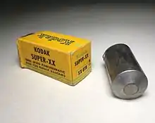 The 828 format uses the same basic film stock as 135 film (standard 35mm film), but the film lacks the sprocket holes of 135. The standard image format is 40 × 28 mm. This provides a 30% larger image compared to 135's standard 24 × 36 mm, yet on the same film stock. Because Kodak targeted 828 at a lower-end consumer market, the film was much shorter, at a standard 8 exposures per roll. 828 film originally had one perforation per frame, much like 126 film.[1] Unlike 135 (a single-spool cartridge film) or 126 (a dual-spool cartridge film), 828 is a roll film format, like 120 film. Like 120, it has a backing paper and frames are registered through a colored window on the back of the camera (except on the original folding Bantams, where images were registered with an index hole).