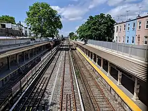 The 86th Street station (also known as Gravesend–86th Street station) is a local station on the BMT Sea Beach Line of the New York City Subway, located at the intersection of 86th Street and West Seventh Street in Gravesend, Brooklyn.[4] It is served by the N train at all times. During rush hours, several W and northbound Q trains also serve the station,[lower-alpha 1] serving as the southern terminus for W trips to Brooklyn.[6]