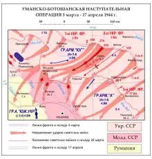 Later that month the division left the Front reserves and was briefly returned to the 48th Rifle Corps, now in 53rd Army.[47] This Army was not directly involved in the encirclement battle around Korsun-Shevchenkovskii but advanced south of the pocket in the direction of Zlatopil. In February the division left 48th Corps and was again under direct Army control, but in March, during the Uman–Botoșani Offensive, it was assigned to the 26th Guards Rifle Corps.[48] The division would remain in this Corps for most of the rest of the war.[49]