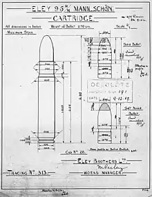 The 9.5×57mm Mannlicher–Schönauer (MS) cartridge was adopted for the M-1910 MS rifle and carbine in 1910.[3] (Note: The name Schoenauer is correctly spelled Schönauer with an “umlaut” over the “o” in German.) The 9.5×57mm MS is also known as the 9.5×56mm MS, the 9.5×56.7mm MS, and the .375 Rimless Nitro Express (RNE) × 2¼ (primarily in England). The cartridge may have been created by Westley-Richards and Eley in 1908 (rather than by the Oestereichischer Waffenfabrik-Gessellschaft, Steyr (OWS) (Austrian Arms Manufacturer-Association, Steyr)), but no production rifles in this caliber have been found prior to the M-1910. This development by or on behalf of Steyr was probably an answer to the development by the noted British gunmaking firm of Holland & Holland in 1905 of their .400/375 Belted Nitro Express, designed for their specially modified Mannlicher–Schoenauer rifle (they imported the actions from Austria, but built the rifles in house). Whether the development of the 9.5×57mm Mannlicher–Schoenauer cartridge originated with OWS or with Holland's British competitor, Westley Richards certainly was the principal promoter of the new 1910 Model Mannlicher–Schoenauer rifle as evidenced by catalogs of the time. The 9.5×57mm MS is the last pre-war proprietary cartridge by Steyr and their most powerful until the recent advent of the .376 Steyr, which has its antecedents in the 9.5×57mm.