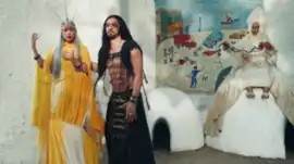 The video begins with Gaga in a desert sprawled out next to a broken bicycle and pomegranates spilled on the ground. Gaga's eyes are concealed behind a red mesh mask from London-based Dead Lotus Couture.[62] A figure dressed in black riding a dark horse lures her out of the dunes and into a mission. As the song starts, she enters the mission filled with oddly dressed people, including a man banging his head onto a pillow and a woman resembling Santa Muerte cradling a mummy.[63] Additional characters call a man dressed in black and a woman dressed in white, who fly down from the sky hoisting an umbrella, as they watch Gaga move throughout the mission's courtyard. The two characters try to engage with Gaga, but she continues to drift away from them. When Gaga is trying to fly away, with a glory around her head, the man pulls her back down to the ground with a rope. Later in the video, Gaga appears in a black leather jumpsuit decorated with flowers, which covers her whole body. An item resembling an ambulance spinal board is brought in behind her. Everyone gathers inside the mission to watch Gaga, as the woman in white opens a wooden box akin to a defibrillator.