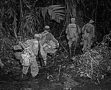 An advance party of the 93rd Infantry Division arrived at Guadalcanal on 29 January 1944. The rest of the division landed between 6 February and 5 March, one regiment disembarking at the Russell Islands on 7 February. The bulk of the division engaged in training, labor and security duties on Guadalcanal and the Treasury Islands from 7 June and both Hollandia Dutch New Guinea from 30 October. Component units performed similar duties on Finschhafen from 12 October 1944 to 31 March 1945, on Los Negros from 29 September 1944 to 16 March 1945, and on Biak from 10 October 1944 to 1 October 1945. The division's combat elements moved to Bougainville Island on 28 March 1944, and were attached to the Americal Division on the 30th. On that date they entered combat, assisting in attacks on the enemy perimeter. These elements, including the 25th RCT, reconnoitered across the Laruma River on 2 April, and in the Torokina River Valley from 7–12 April 1944. The 25th RCT operated against the Japanese along the Kuma and East-West Trails during May 1944. The combat team left for the Green Islands during May and June. The 93d Rcn. Troop, attached to the XIV Corps, remained to raid, patrol, and maintain perimeter positions. The troop began training 12 September 1944, and moved to Finschhafen on 1 November. Security patrols had scattered contacts with the enemy at Urapas from 3 to 15 January 1945, at Wardo on Biak from 6 November-22 December, and at Wari on Biak on 31 December. The security detachments at Wardo and Wari were withdrawn on 9–10 February 1945.