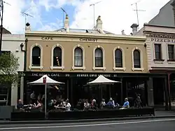 The shop at No. 95 was Thomas Claydon's butcher from 1868 until 1902, then Joseph Brigg's butchery until 1908. The cool room in the cellar from this early use of the building still remains. A clothier, initially Cohen Bros, then later Abraham Cliffe replaced the butchery and Cliffe continued to trade there until 1922. After this the shop became a grocer until the 1950s. Of the three shops No. 97 had the most varied occupation history, tenants including Yeoman, a painter, then a fishmonger, restaurant, hairdresser and bird dealer occupied the premises for almost 30 years until 1906. Between 1923 and 1931 the Empire Service Club had a reading room in No. 97. This club was formed by the ANZAC Fellowship of Women under Dr Mary Booth's leadership in 1923 as a welfare organisation for boys brought to Australia to train as farm labourers under the "Dreadnought scheme" between 1911 and 1939.[1]