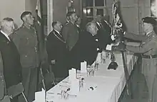 Captain R. Matthews, Chaplain attended by Officers and supported by men of the Regiment, then entered the Council Chamber carrying the Guidon and halted in front of the Mayor. He then, on behalf of the Commanding Officer and all ranks of the Regiment, requested that the Council accept and keep in safe custody the Regimental Guidon.