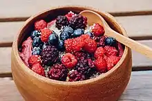 Açaí na tigela ("açaí in the bowl") is a Brazilian dessert from Pará and Amazonas, where the Ribeirinhos people prepare it regularly.[1][2] It is a dish made with the frozen and mashed fruit of the açaí palm, described as having an "earthy" or creamy taste.[3] Its texture is granular before blending and it has a tartness from a high acidity content, making its taste appealing.[4] It is served as a smoothie in a bowl or glass,[5] and is commonly topped with granola and banana, and then mixed with other fruits and guaraná syrup.[6]
