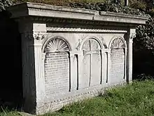 A wide stone in a combination of classical styles and Arts and Crafts decoration was erected over the tomb. To Mundella's name was added the inscription: "Loving knowledge for its own sake, he strove to diffuse it among his countrymen. He laboured for industrial peace, and the welfare of the children of the poor."