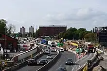 Consultation on the design of a solution began 2009.[11] Split level junctions including passing under or over the A63 were considered for the bottleneck at the Mytongate roundabout,[map 1] with additional congestion easing measures, and pedestrian bridges. Other options included an extended viaduct and tunnel options – the consultation showed a preference for an underground solution. In March 2010 the Highways Agency established a preferred scheme – the A63 would be lowered 23-foot (7 m) at the Mytongate bottleneck, and the north south connecting roads raised slightly (3.3-foot (1 m)), creating a split level junction; additionally the eastbound carriageway would be widened, and pedestrian crossings created.[12][13] If funded, construction was planned to begin in 2016 for completion in 2019.[14] The cost has been estimated at between £150 and £200 million.[15][16] In May 2012 the design and consultation work was initiated.[17][18] In June 2013 the government announced the go ahead for a £160 million improvement to the road after 2015.[19] From 2021, work began on Mytongate, and is predicted to be finished in 2025. A bridge called Murdoch's Connection was also constructed further east than the junction between the Princes Quay Shopping Centre and Hull Marina which allows for safe pedestrian crossing and fewer traffic lights, as well as greater connection between the main city centre area to the upmarket Humber Street area of the city centre.