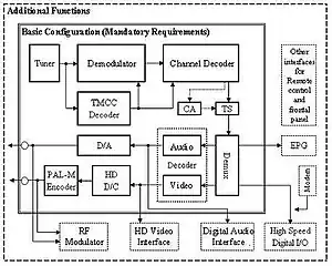 The Brazilian technical standard for digital television concerns specifications of receivers for digital broadcasting, and specifies, in particular, minimum basic functions and essential requirements to satisfy initial needs for the deployment of digital terrestrial television broadcasting. The standard does not cover features which affect the quality of the displayed picture or application rather than whether receiver is able to decode pictures at all. Such issues are left to the marketplace.