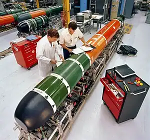 ![]() Technicians perform maintenance on a Mark 48 torpedo in 1982. | |