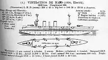 Veinticinco de Mayo was a steam-powered protected cruiser similar to Piemonte built in the same shipyard for the Royal Italian Navy, but improved and larger. Its steel hull had a ram in the bow, and was protected with an armored deck.