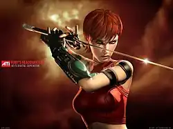 "Ruby", a fictional female character described as a "mercenary for hire", was created by ATI to promote some of its products.[15] Computer-animated videos produced by RhinoFX about Ruby on a mission (being a sniper, saboteur, hacker and so on) appeared at large technology shows such as CeBIT and CES.