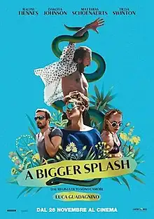 A Bigger Splash is a 2015 psychological drama film directed by Luca Guadagnino and with a screenplay by David Kajganich from a story by Alain Page. Starring Tilda Swinton, Matthias Schoenaerts, Ralph Fiennes, and Dakota Johnson, the film is loosely based on the 1969 Jacques Deray film La Piscine[3] and named after the 1967 David Hockney painting of the same name.[4] It is the second instalment in Guadagnino's self-described Desire trilogy, following I Am Love (2009) and preceding Call Me by Your Name (2017). It competed for the Golden Lion at the 72nd Venice International Film Festival.[5][6]