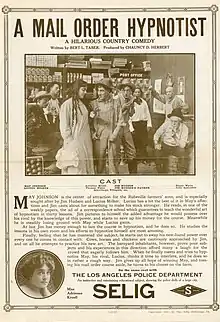 A Mail Order Hypnotist is a 1912 American silent film drama produced by Chauncey D. Herbert. The film stars Adrienne Kroell and Thmas Flynn. The film was distributed by the General Film Company and released together with The Los Angeles Police Department or The LAPD. The film status is uncertain but a release flier survives which is now at the Margaret Herrick Library at the Academy of Motion Pictures Arts and Sciences. The split reel measured around 800 feet (225 m).[1]