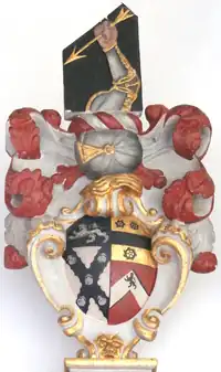 Above are shown the arms of Baker: Argent, on a saltire engrailed sable five escallops of the first on a chief of the second a lion passant of the first; impaling the arms of his two wives: in chief: Or, a fess between three Catherine wheels sable (possibly Brentingham[11]); in base: Gules, on a chevron argent a lion rampant sable. Above is the crest of Baker: A man's dexter arm embowed argent garnished or grasping in the hand an arrow point downward of the last.