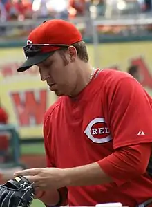 On February 6, 2007, Harang signed a four-year, $36.5 million contract with the Cincinnati Reds.[4] On July 23, 2007, Harang threw ten innings for the Reds (throwing 121 pitches), becoming the first Reds pitcher to do so since 1989. However, he received a no-decision because the Reds did not win the game until the 12th inning. On September 3, 2007, he became the victim of the 3,000th strikeout recorded by the New York Mets' Pedro Martínez. Harang ended the season with an NL-leading 4.19 strikeout-to-walk ratio and 12 wild pitches.