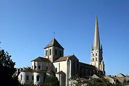 The cruciform church carries a square tower over its crossing. The transept was built first, then the choir with its ambulatory with five radial chapels in the polygonal apse. In the next building campaign, three bays of the nave were added, the bell tower and its porch, and finally the last six bays of the nave. The bell tower is finished by a fine stone spire more than 80 meters high, added in the 14th century and restored in the 19th century.[1] The barrel vaulted nave is supported on magnificently-scaled columns with foliate capitals.