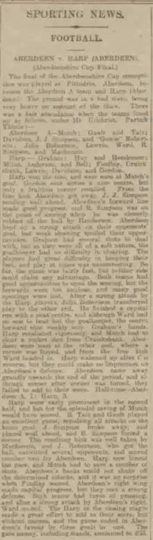 The club's earliest competitive football came in the Aberdeenshire Cup in the 1904–05 season, and it entered the competition every season until 1911–12. Its first season in the competition was its best, as it won through to the final, only losing 3–2 to the new combination Aberdeen F.C. side, albeit a reserve Aberdeen XI. [3] Harp repeated the run to the final in 1906–07 but this time lost 3–1 to the same outfit.[4]