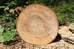 Specimens have historically been able to live up to nearly 300 years, but in modern stressed conditions, 100 years is more typical.[3] A number of defoliating insects threaten the tree; in the late 20th century, western spruce budworm epidemics killed sizable populations of grand fir in the eastern Cascades and Blue Mountains.[3] The lack of an ability to use pitch to patch wounds, including those from logging and small fires, provides a weakness exploited by rot fungi.[3] East of the Cascade ridge, grand fir trunks are infected by Indian paint fungus, indicating a rotten core; such specimens are often waterlogged and thus crack apart in freezing weather.[3]
