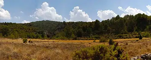 The site is on the left bank of a small ravine, the Barranco de Ahillas; it is a rock shelter between 2 and 9 meters deep, and 38 meters long, facing the northwest.[1] Because of the lack of direct sunshine and its exposure, the site was occupied only from June to October, according to Phytoliths and other evidence, including the reuse and resharpening of stone tools.[2] The area is bordered by two rivers, the Rio Tuejar and the Turia, and two mountain formations, the Sierra de Javalambre (part of the Sistema Ibérico) and the Serra d’Utiel. The site's location, at the entrance of a valley with a dead end, allowed for hunting and trapping large herbivores. The river that (intermittently) runs through the canyon opens onto a plain, and thus the site accessed three different biotopes: the riverside, the mountains, and a plain, so many different kinds of prey could be hunted.[2]