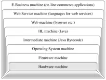 Abstract machine hierarchies are often employed, in which each machine uses the functionality of the level immediately below and adds additional functionality of its own to meet the level immediately above. A hardware computer, constructed with physical electronic devices, can be added at the most basic level. Above this level, the abstract microprogrammed machine level may be introduced. The abstract machine supplied by the operating system, which is implemented by a program written in machine language, is located immediately above (or directly above the hardware if the firmware level is not there). On the one hand, the operating system extends the capability of the physical machine by providing higher-level primitives that are not available on the physical machine (for example, primitives that act on files). The host machine is formed by the abstract machine given by the operating system, on which a high-level programming language is implemented using an intermediary machine, such as the Java Virtual machine and its byte code language. The level given by the abstract machine for the high-level language (for example, Java) is not usually the final level of hierarchy. At this point, one or more applications that deliver additional services together may be introduced. A "web machine" level, for example, can be added to implement the functionalities necessary to handle Web communications (communications protocols or HTML code presentation). The "Web Service" level is located above this, and it provides the functionalities necessary to make web services communicate, both in terms of interaction protocols and the behaviour of the processes involved. At this level, entirely new languages that specify the behaviour of so-called "business processes" based on Web services may be developed (an example is the Business Process Execution Language). Finally, a specialised application can be found at the highest level (for example, E-commerce) which has very specific and limited functionality.[9]