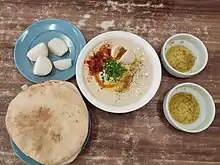 The restaurant's menu is very limited. The restaurant serves only four basic courses - hummus, masabacha, brown beans (ful medames) and labane - and dishes that combine them.[3] The famous dish of the restaurant is the triangle (in Arabic: Mutha'alat, in Hebrew: Meshulash), a triangular dish that includes hummus, ful and masabacha. With the dishes, pitas, fresh onions, and saucers of hot sauce with lemon salt are served.